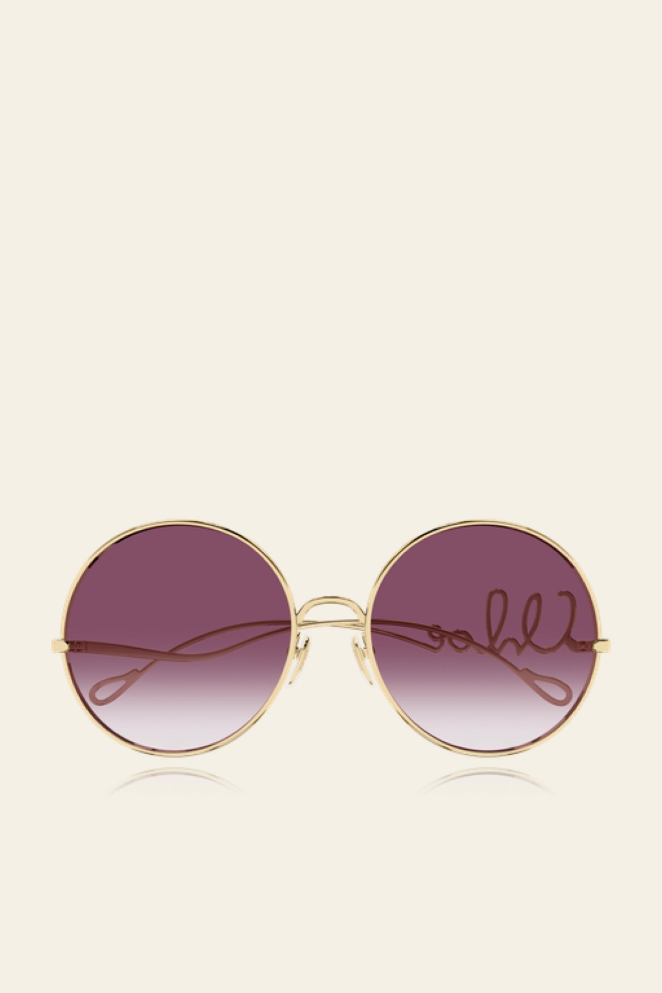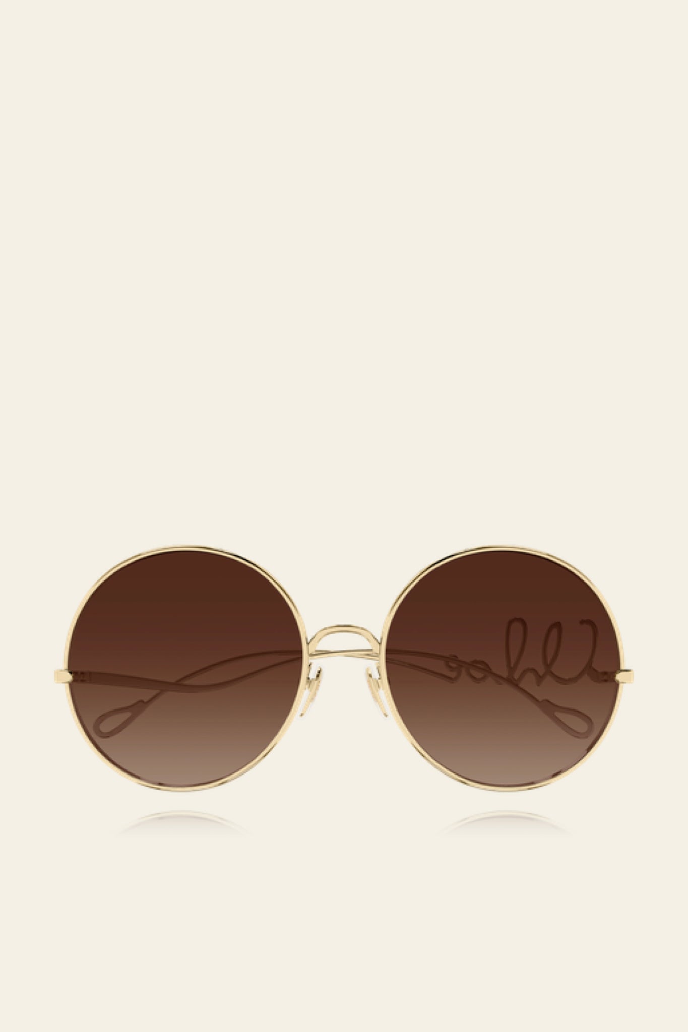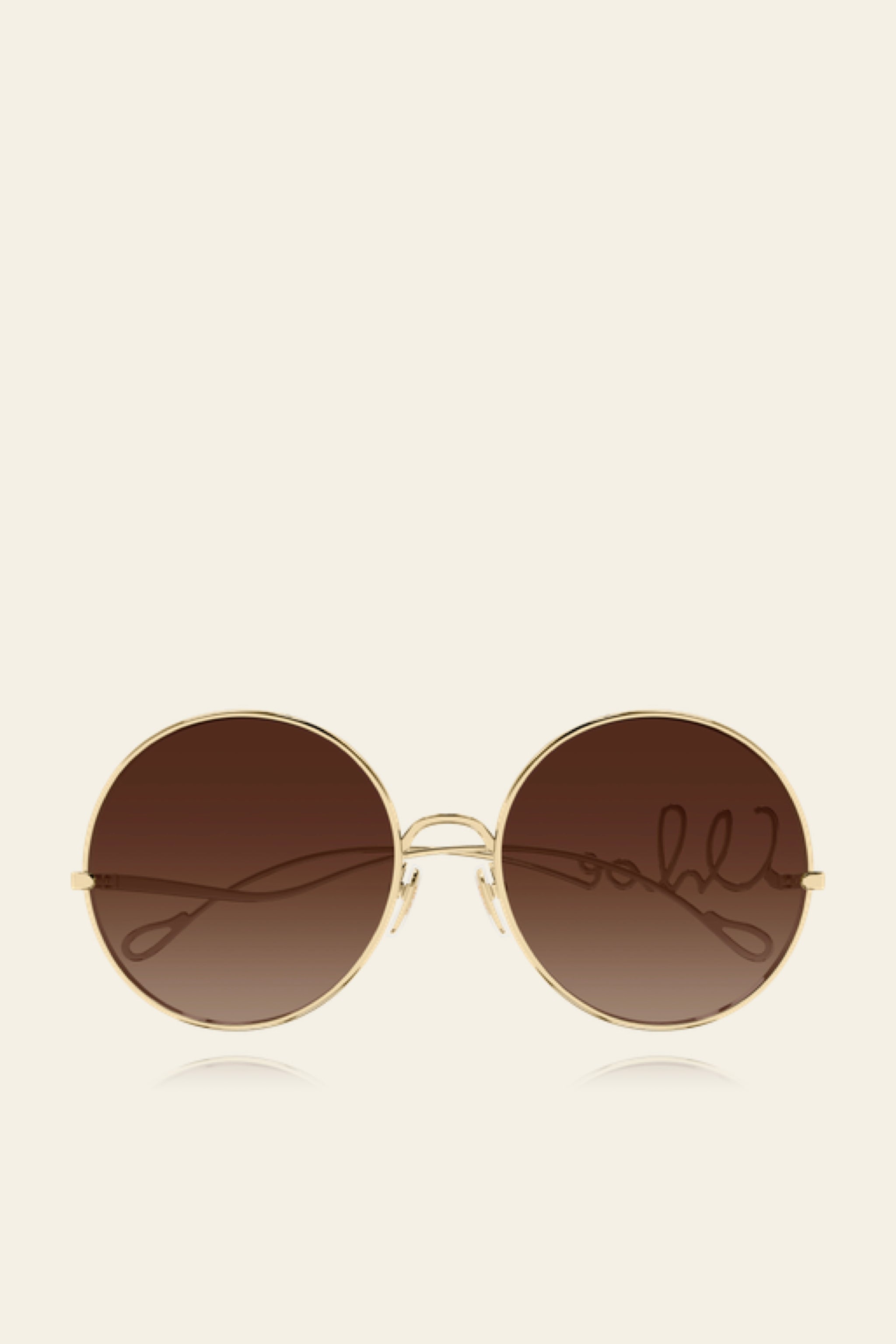 Rounded oversized style with Chloé iconic logo that seems to be written in one unique row on the left temple. Featuring shiny endura gold construction inspired by the jewels of the Maison, and dark lenses that highlight the frame.